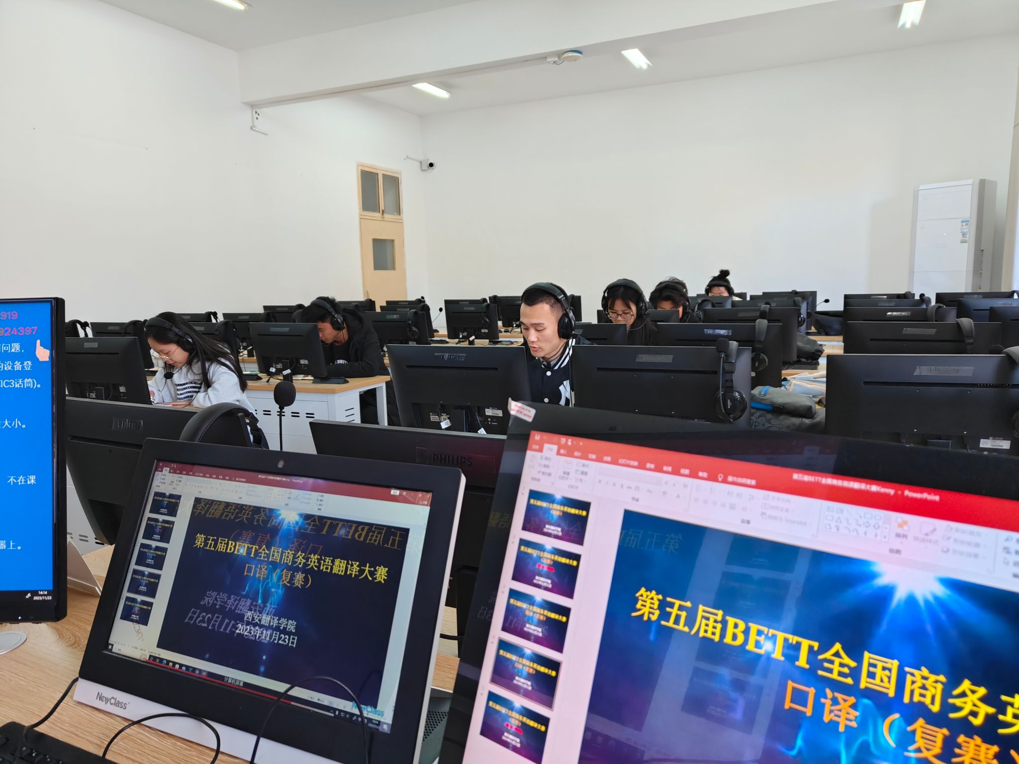 2023年11月23日,由西安翻译学院举办,英文学院承办的第五届BETT全国商务英语翻译大赛(复赛)成功落下帷幕。此次翻译大赛分为口译和笔译两段赛程。口译赛于11月23日下午2:00~3:00在多媒体语言实验室15进行。笔译赛于下午17:00~20:00在1号楼三层1322教室进行。来自学校不同专业50多名选手分别进行了相应比赛,并在笔译复赛前举行了口、笔译初赛的颁奖仪式。