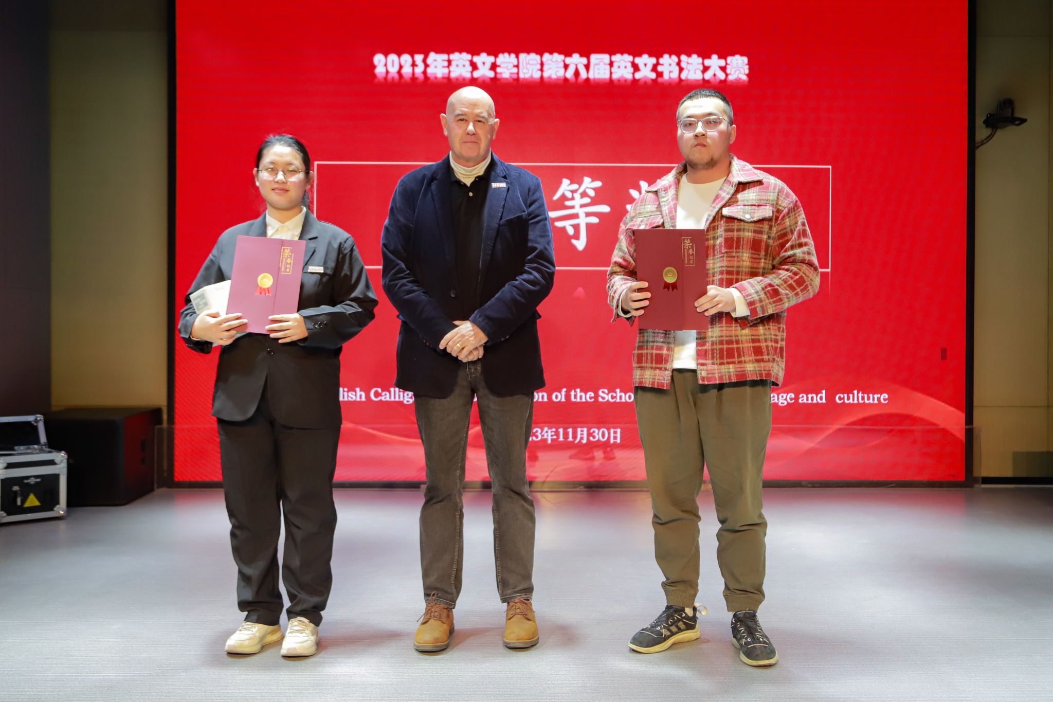 本次英文书法大赛历时一个月,分为线上投票+线下评比两个环节,共有163名学生报名并上传作品,经过线上投票共有12名学生参加决赛。比赛当天,选手们通过短视频的方式介绍他们与英文书法之间的故事,并在规定时间内完成《习近平谈治国理政》英文版第二卷中的段落选取的书写内容,在展示英语书法技能的同时,也书写着中国故事。外籍教师Mr.Steve,校级督导甄建明教授,闫福祥副教授、SLG教辅团队负责人李燕老师作为评委,为本次比赛评比出优秀的作品。