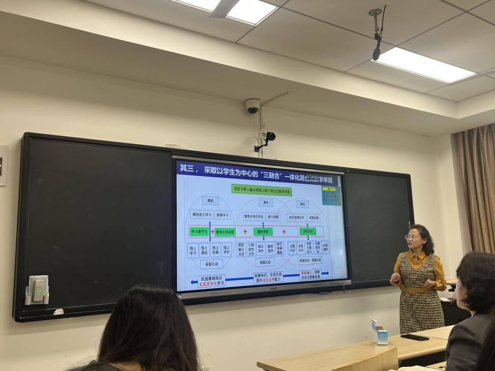 2024年4月7日下午14:30在1217教室,英文学院举办了一场以“课程发展与教学竞赛”为主题的教学研讨会。李鲜花教授就“融语言教育与审美--《高级英语》课程教学创新实践”做了详细的分享,展示了该课程创新建设的实施路径和成果。