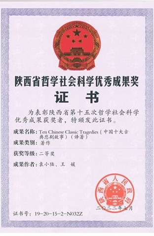 近期,陕西省人民政府发布了《陕西省人民政府关于表彰第十五次哲学社会科学优秀成果的通报》(陕政字【2022】53号),我院院长袁小陆教授和王媛老师的译著《Ten Chinese Classic Tragedies(中国十大古典悲剧故事)》 荣获二等奖;