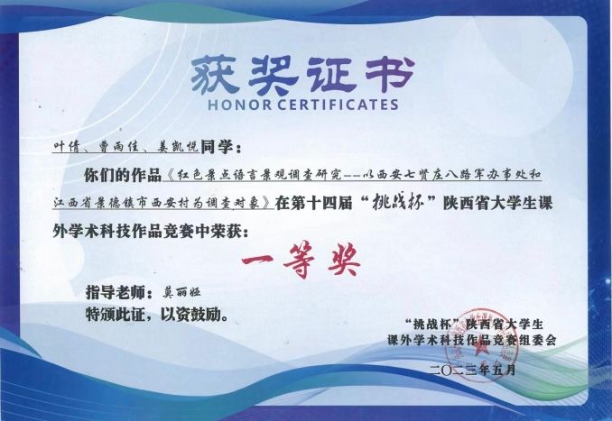 大赛启动以来,英文学院高度重视,精心组织、广泛动员,对参赛项目悉心指导,采取“项目汇报+问辩” “项目路演+针对辅导”等辅导模式,邀请多位专业教师,结合历年项目案例和学院特色,富有前瞻性地为项目提供了宝贵的经验与参考。参赛师生积极备战、克服困难,利用课余时间不断打磨,项目内容得到充分增进,答辩能力得到明显提升。经过校级初赛、复赛、终审决赛,英文学院莫丽娅副教授指导、叶倩、曹雨佳、姜凯悦代表队的调研作品《红色景点语言景观调查研究——以西安七贤庄八路军办事处和江西省景德镇市西安村为调查对象》入围省赛,并最终获得省赛一等奖的好成绩。