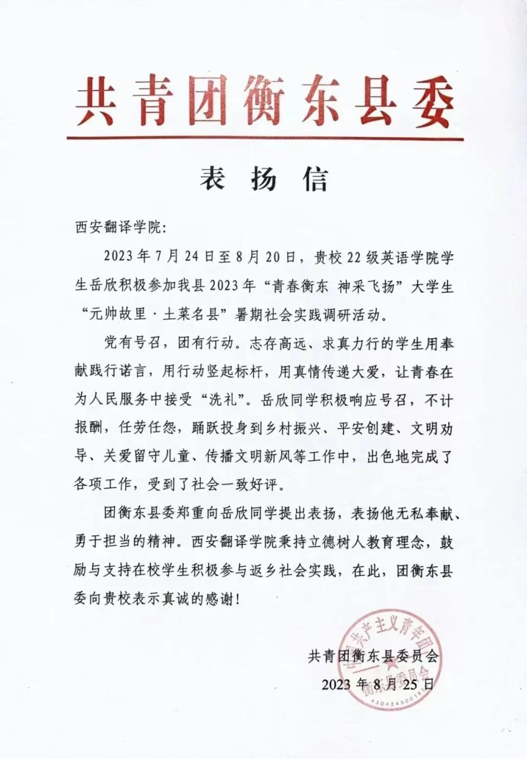近日,英文学院岳欣同学收到了来自共青团衡东县委员会的一封表扬信。感谢我校在推动暑期社会实践工作中的努力,表扬岳欣同学无私奉献、勇于担当的精神。