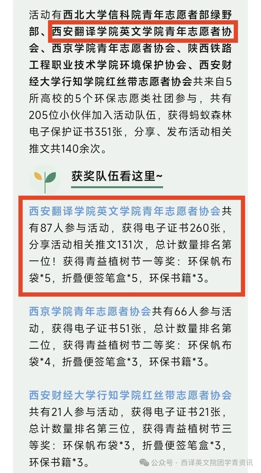 西安翻译学院英文学院青年志愿者协会在西安市青益志愿服务发展中心所举办的助力生态,心中有“树”线上植树活动获得青益植树节一等奖!