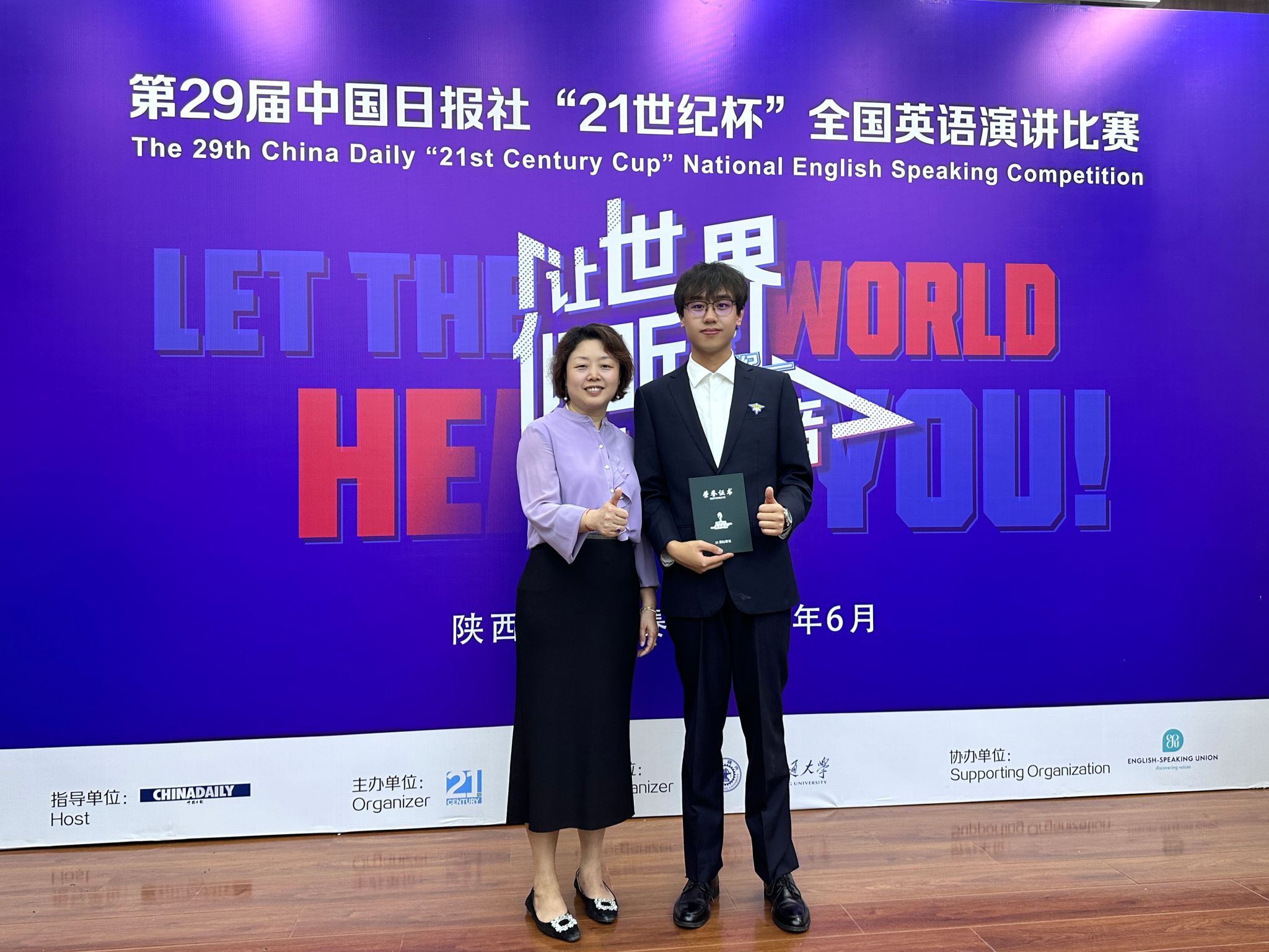 2024年6月1日,由中国日报社发起并主办的第29届中国日报社“21世纪杯”全国大学生英语演讲比赛陕西地区决赛于西安交通大学圆满落幕。 经过近七个小时激烈的角逐,由我校英文学院李燕老师和孙斐然老师指导的23级英语专业江星磊同学和23级专升本德语专业安思炀同学在赛场中表现优异,荣获三等奖!