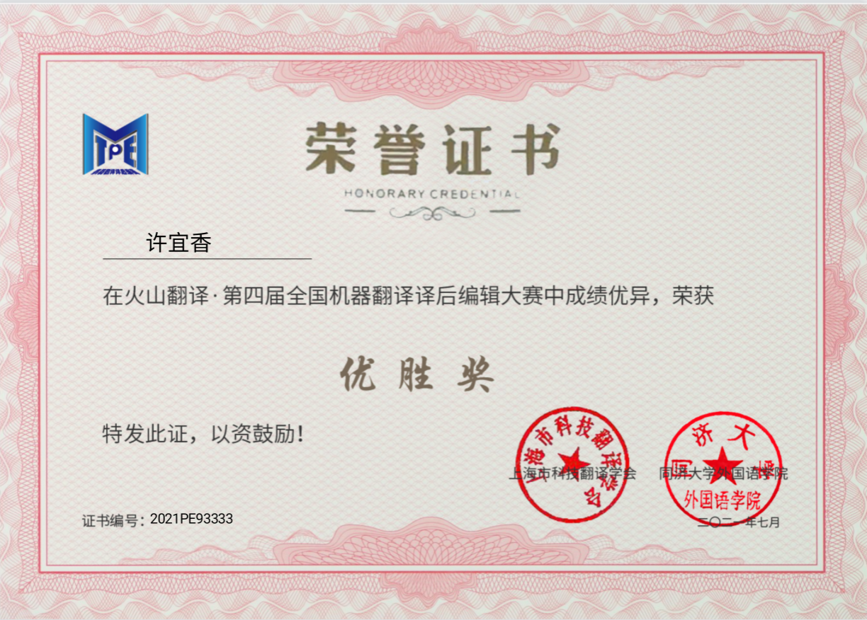 全国机器翻译与译后翻译编辑大赛是一项全国性学科竞赛,目前已连续举办四届。该竞赛由同济大学外国语学院与上海科技翻译学会联合主办,全国翻译专业学位研究生教育指导委员会任指导单位。该竞赛参加者主要是高校的翻译业余爱好者与企事业单位的职业译员,且大赛对国内外选手开放。目前,我院学生已连续参加三届,取得第二届全国机器翻译与译后翻译编辑大赛优秀奖1个、第三届全国机器翻译与译后翻译编辑大赛优秀奖1个、第四届全国机器翻译与译后翻译编辑大赛优秀奖2个,并获得第四届全国机器翻译与译后翻译编辑大赛优秀组织单位奖。