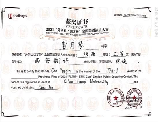 我院历来重视学生的实战训练,并专门成立“语言实践工作坊”,致力于培养具备精湛的语言表达和舞台展示能力的学生。2020年和2021年,经过层层选拔,我院学生李旭亮和曹月琴脱颖而出,代表学校参加陕西省复赛,并获得三等奖的好成绩。