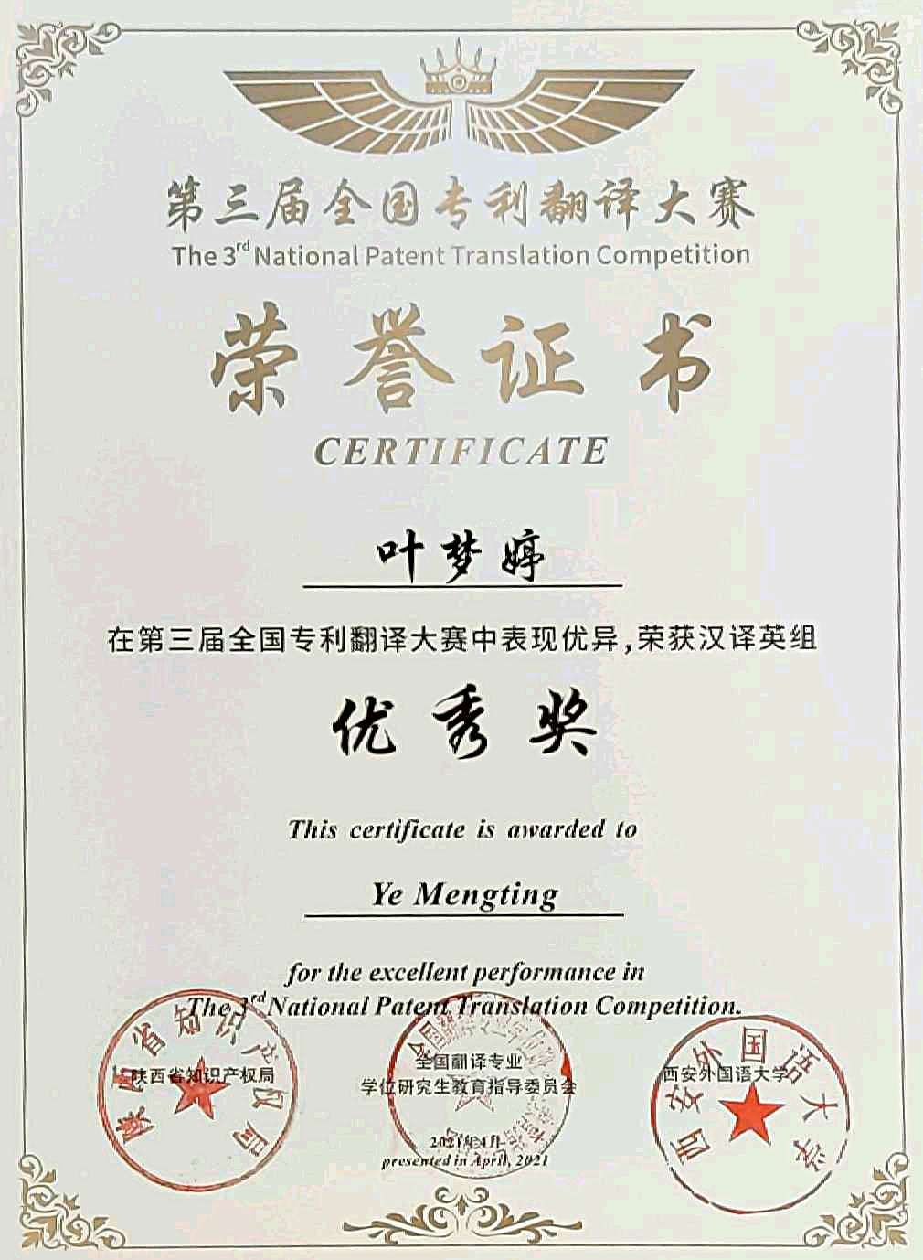 全国专利翻译大赛是一项强化知识产权保护、推动知识产权与翻译学科紧密融合的全国性翻译学科竞赛,主办单位为西安外国语大学主,指导单位为全国翻译专业学位研究生教育指导委员会、陕西省知识产权。旨在在全社会夯实知识产权语言服务人才培养根基。目前,在2021年第三届全国专利翻译大赛中,英语专业共获优秀奖两项。