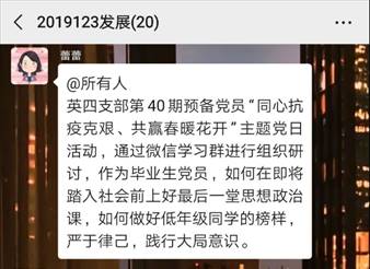 在本次活动中,英四支部全体成员切实做到抗击疫情,我们在行动!作为既是毕业生又是预备党员的我们,在即将踏入社会前不忘初心,牢记使命,上好最后一堂思想政治课,进一步强化党员意识,增强组织纪律观念,在疫情期间,合理安排分配学习时间,严格要求自己,为低年级同学做好自律自省的榜样以及文明安全离校的表率。