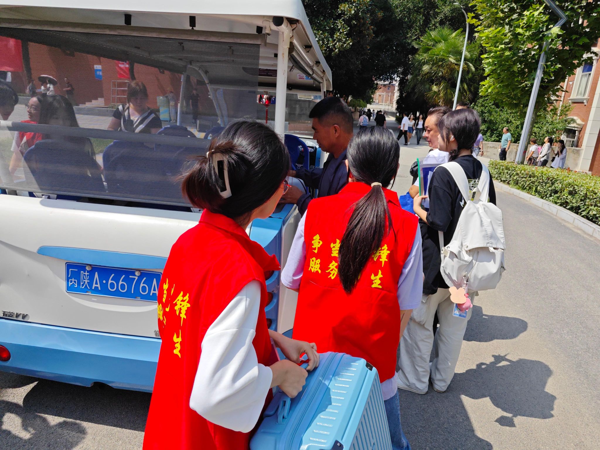 待新生们集中到转运点,负责搬运行李的入党积极分子们已早早在此等候,接过手中行囊,以热情周到的服务帮助接送新生。入党积极分子们有条不紊,积极对接摆渡车与新生及其家长,充分传递西译人担当奉献的精神。