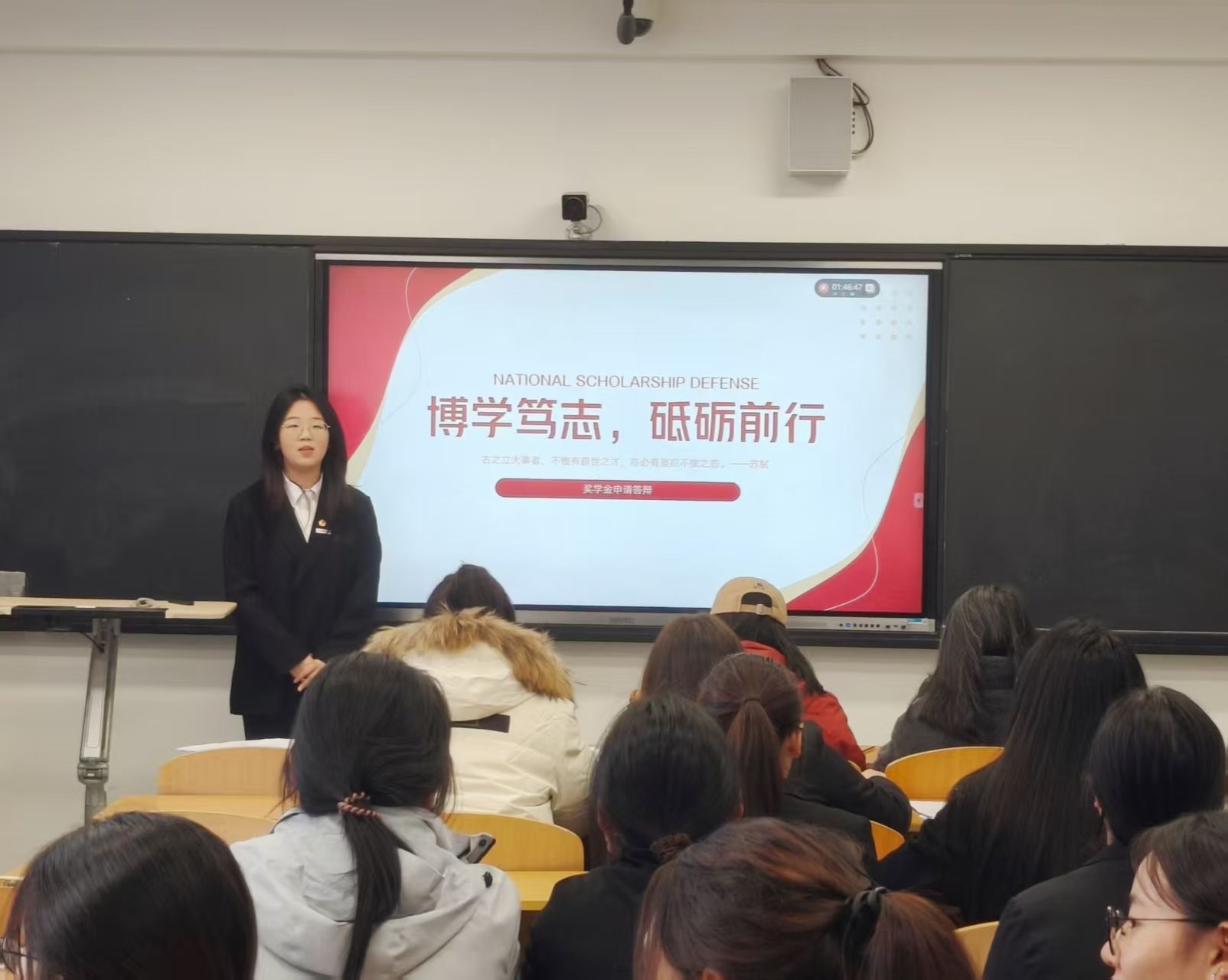 评审过程中,评委组秉持“客观公正、优中选优”原则,结合申报材料与现场答辩表现,从思想觉悟、学业水平、实践创新、综合素质等多维度进行全面考量、精准评分。同时,评委们针对学子们的展示内容提出针对性指导建议,既为他们的未来发展指明方向,也让答辩现场成为交流学习、共同提升的平台。评委老师们强调,奖学金既是对学子过往努力的肯定,更是对未来前行的期许,希望获奖学子能珍惜荣誉、再接再厉,充分发挥示范引领作用。