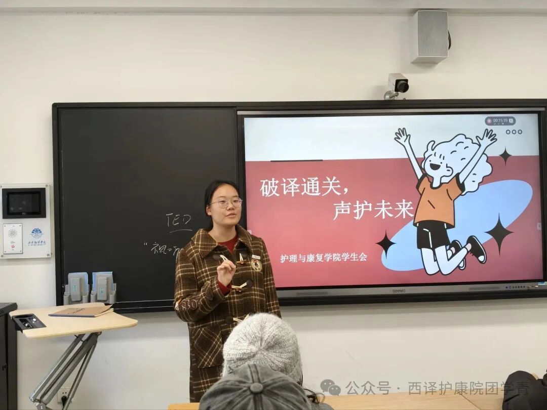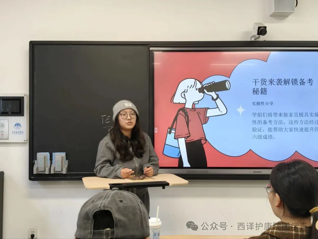 为帮助同学们高效备考英语四六级,11月25日,护理与康复学院学生会在1024教室举办以“破译通关,声护未来”为主题的四六级经验分享会。本次分享会邀请在四六级考试中获得高分的苗晴雯、王艺璇、张欣悦担任分享嘉宾,学生会执行主席李梦、学生会干事以及部分学生参与其中。