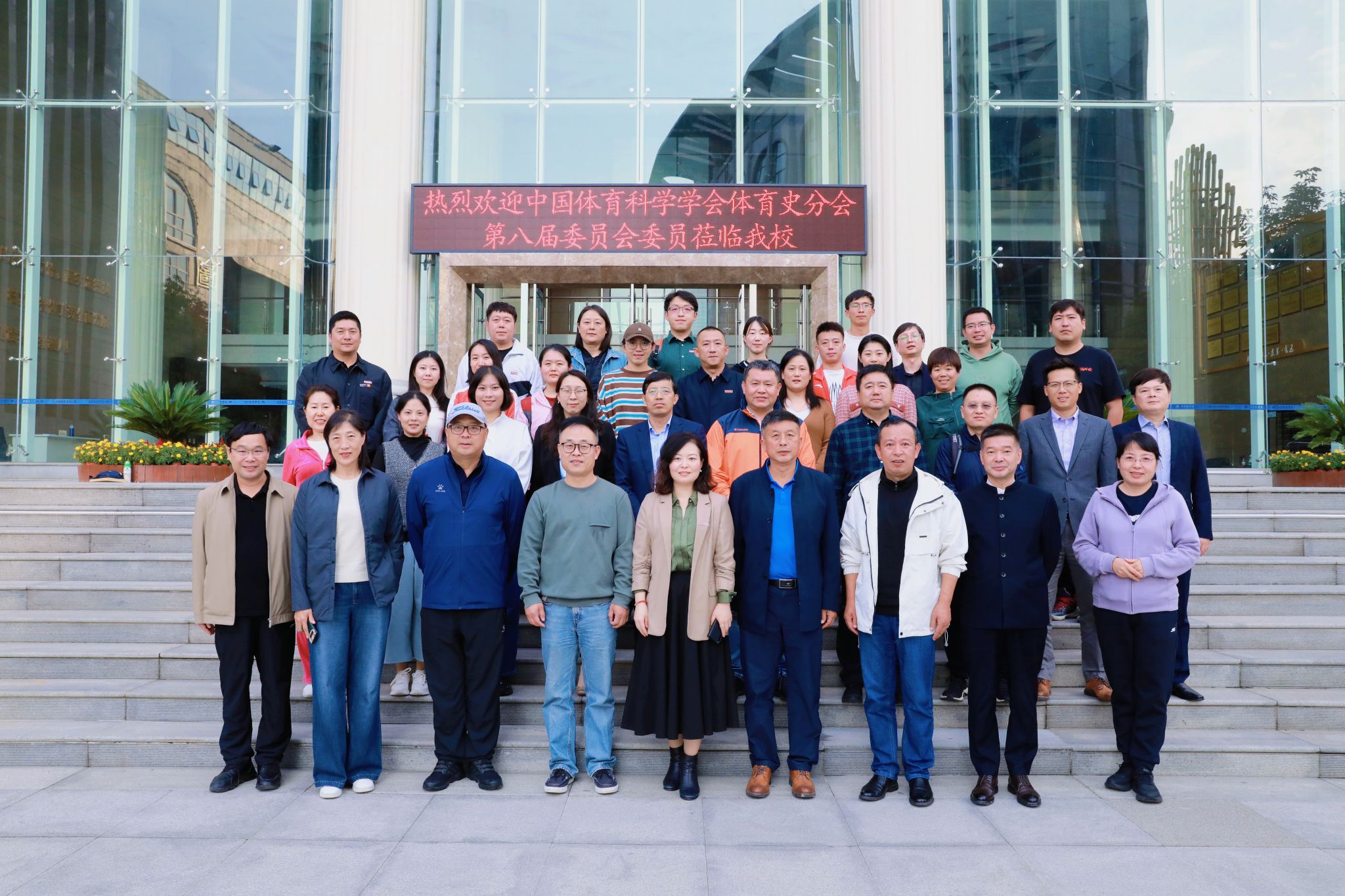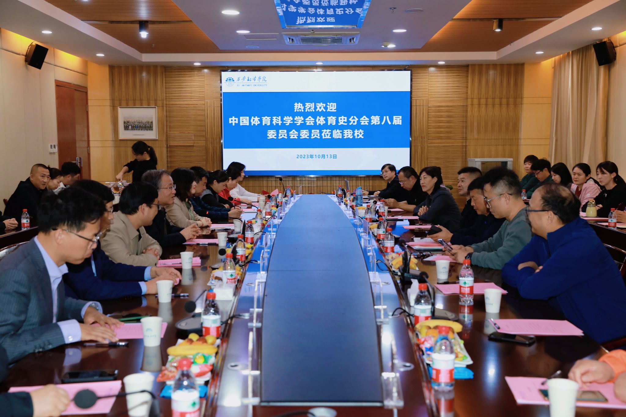 10月13日下午, 中国体育科学学会体育史分会第八届委员会委员一行17人在副主任委员、中央民族大学韦晓康教授的带领下,到西安翻译学院参观交流。西安翻译学院校长崔智林,体育学院副院长马庆、樊磊,科研处副处长高晶晶以及部分师生代表参加交流座谈会。座谈会在科技楼会议举行,由副校长王利晓主持。