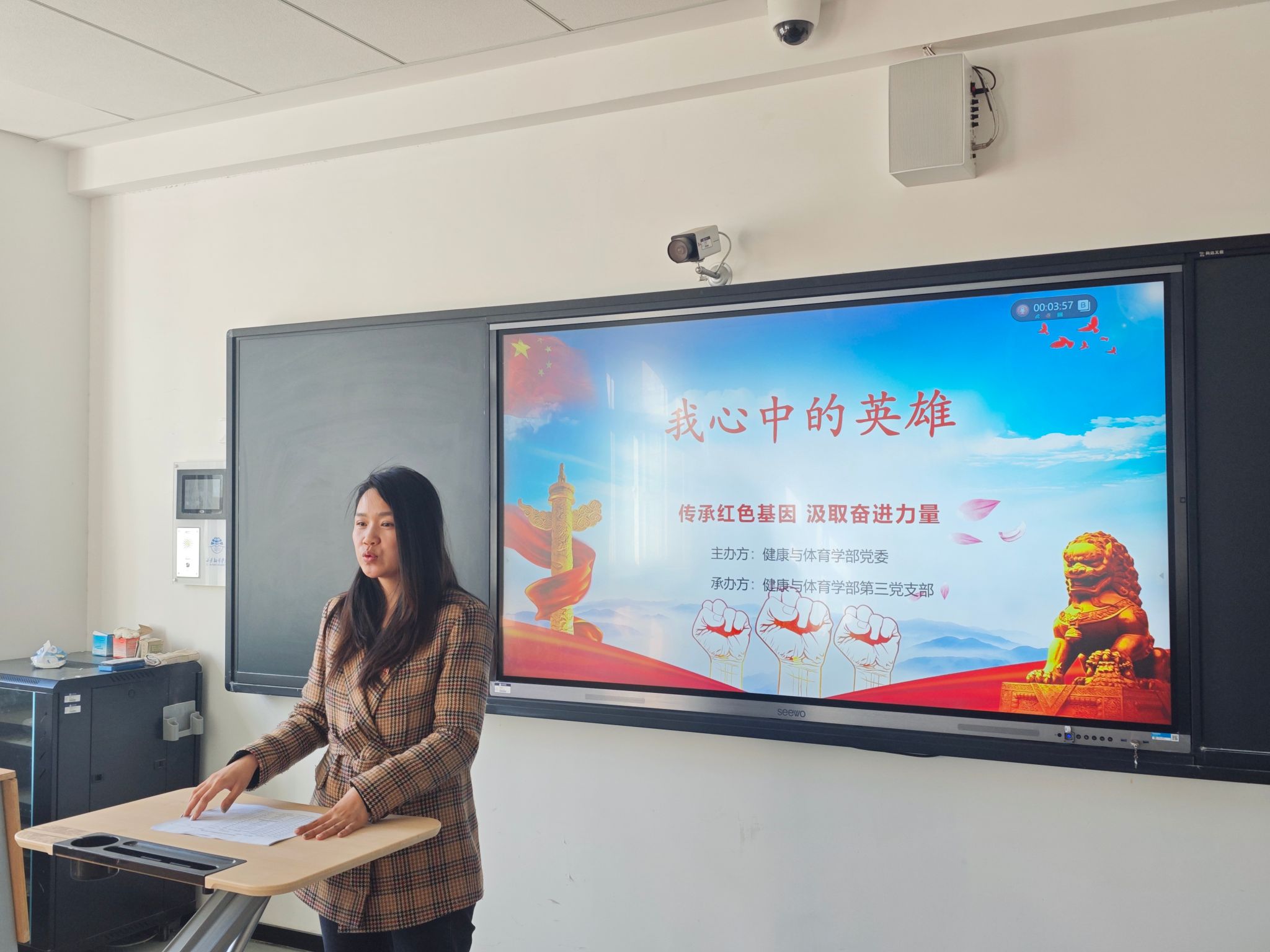 为深入引导广大青年学子树立正确的历史观、民族观、英雄观,从英雄的先进事迹与崇高品格中汲取奋进力量,进一步坚定理想信念、筑牢信仰根基,4月3日,健康与体育学部第三党支部于1018教室成功举办“我心中的英雄”主题教育活动。健康与体育学部第三党支部书记闫丽洁出席活动,支部党员发展对象、入党积极分子、入党培养对象及学生骨干代表齐聚一堂,共同追忆英雄峥嵘岁月,感悟英雄精神力量。