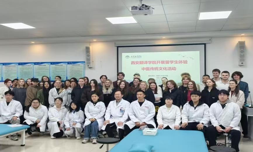 当千年岐黄之术邂逅异域青春风采,一场跨越山海的文化交流在西安翻译学院健康与体育学部温情上演。2026年4月8日,40多名俄罗斯交换生走进健康与体育学部医学系实验中心,在学部党委书记、副部长赵桢宇,副部长蒋啸,综合办主任李栋,实验中心主任叶珍妮以及多名专职教师和学生的全程陪同与专业指导下,沉浸式体验针灸、推拿、拔罐等传统中医疗法,近距离感受中华传统医学的博大精深与独特魅力。