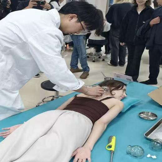 在实操体验区,俄罗斯交换生们兴致盎然、踊跃参与,亲身感受中医疗法的神奇效果。针灸体验区,副部长蒋啸精准取穴、规范操作,让学子们直观领略中医外治的独特疗效;推拿体验区,专职教师杨帅与景岩老师以专业手法舒筋活络,让俄罗斯学生们在舒缓放松中体会经络通畅之感;拔罐与艾灸体验区,艾香袅袅、温煦绵长,学子们沉浸式感受中医“温养调理”的养生智慧;脉诊体验台前,张天瑶老师细致讲解“望、闻、问、切”辨证思路,生动阐释中医“司外揣内”的诊疗思维。