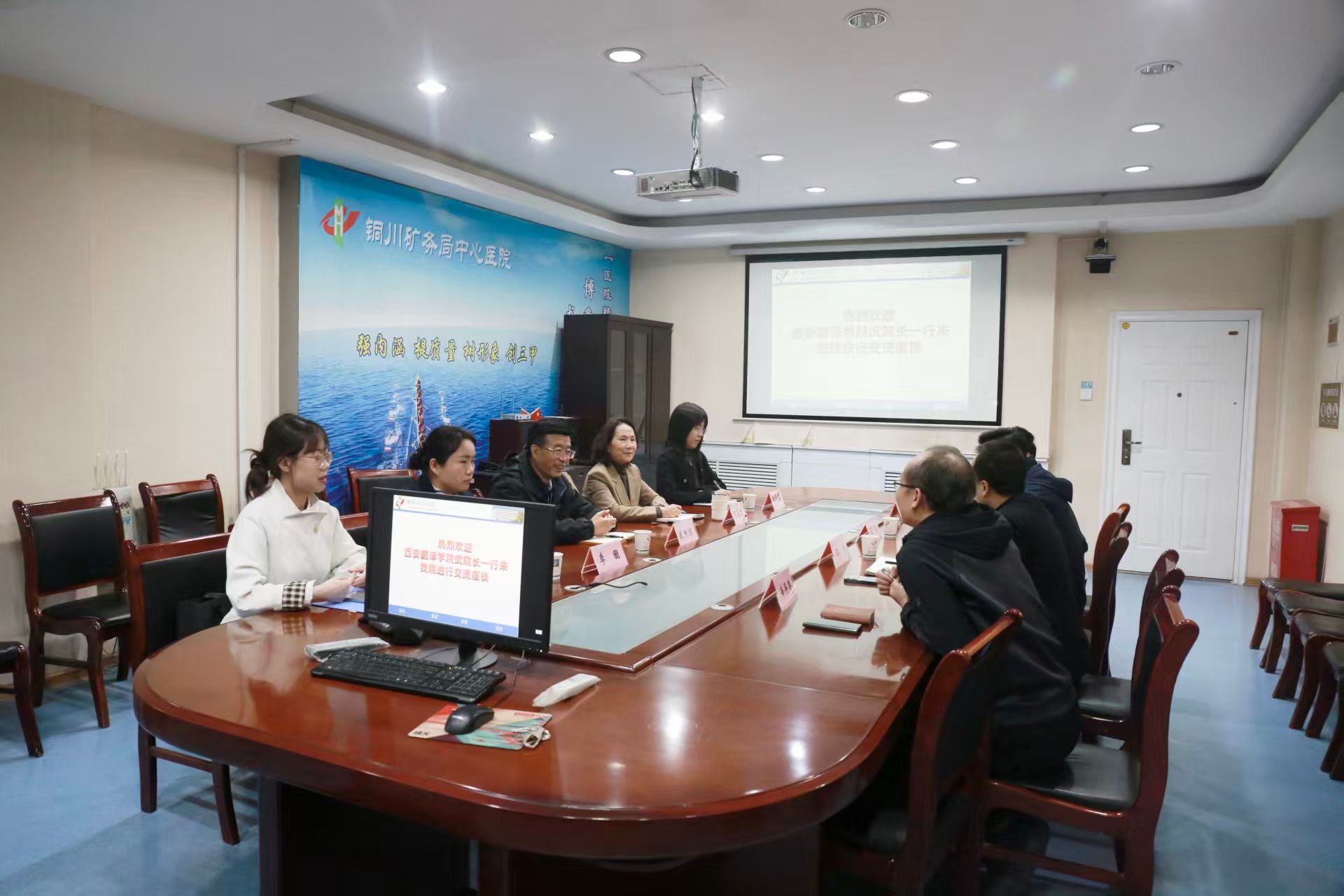 上午,西安翻译学院健康与体育学部一行抵达铜川矿务局中心医院,受到院方代表热情接待,双方在会议室举行交流座谈。铜川矿务局中心医院副院长邵元、副院长刘超、人力资源部主任吴伟青、科教科主任辛平年、护理部主任李豆敏、科教科科员魏成星出席座谈会。