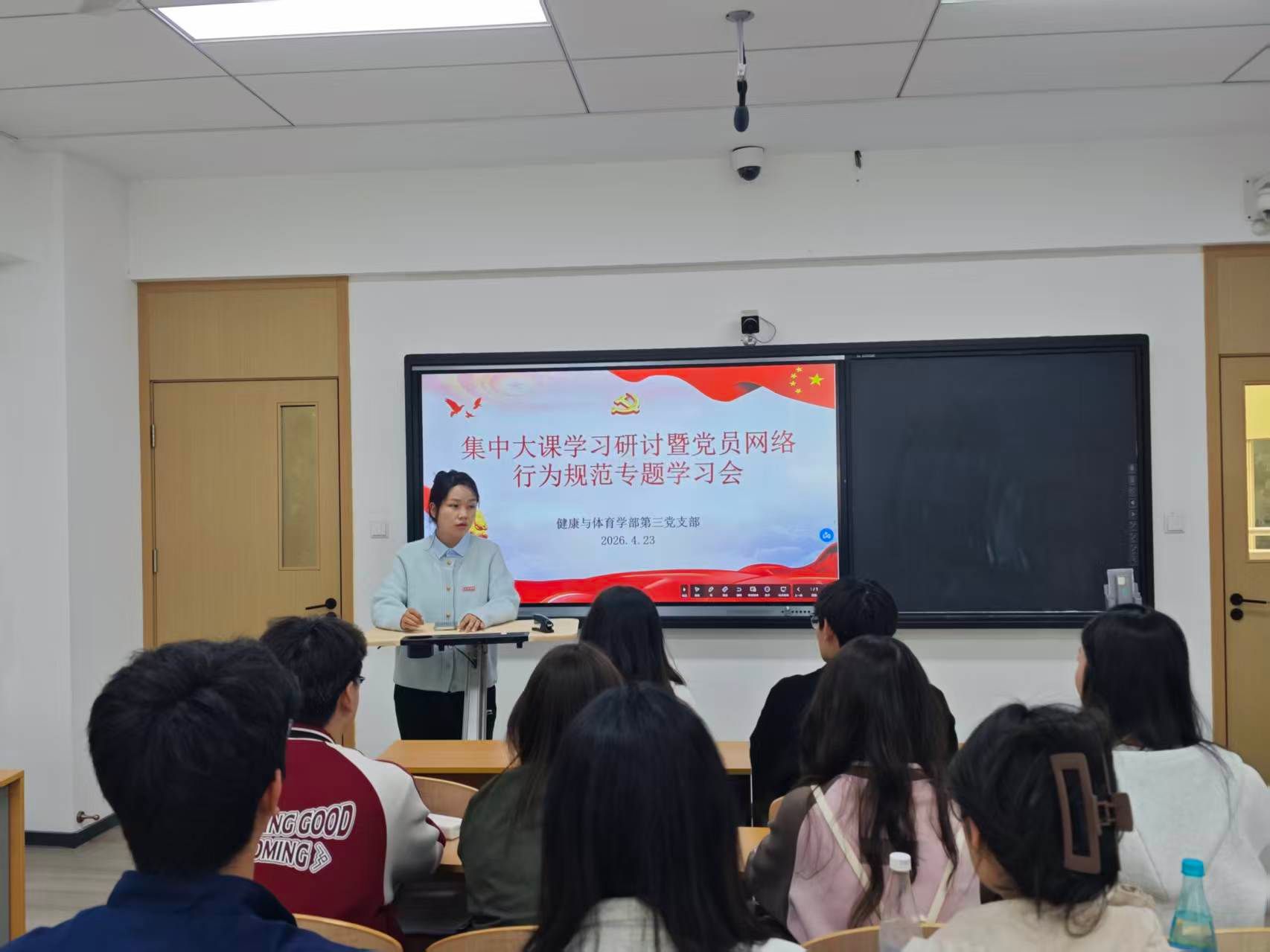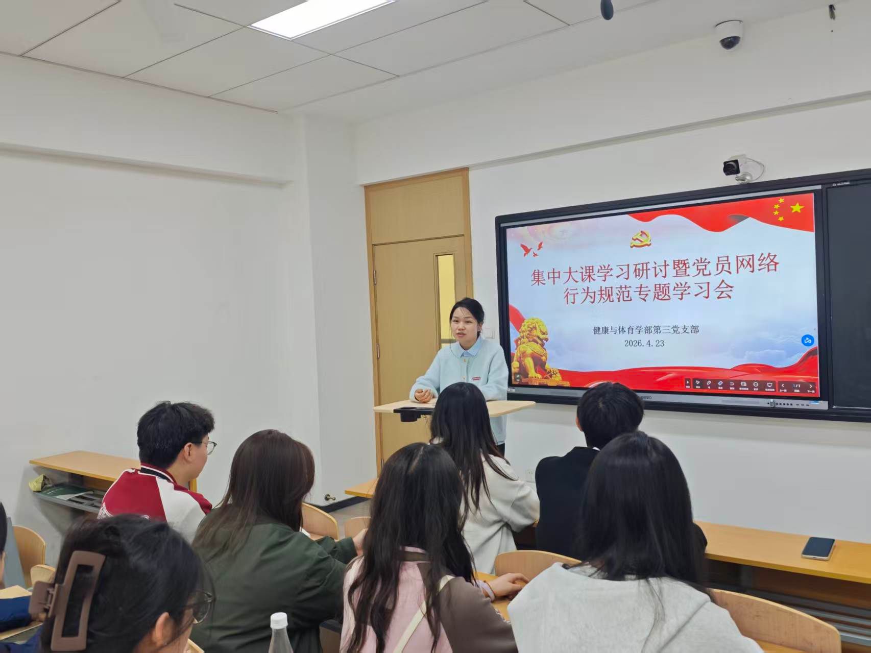 活动现场,支部书记领学大课精神,结合健康与体育学部专业特色与育人实际,引导党员将理论学习融入健康服务与学生管理,切实做到学思用贯通、知信行统一。随后,带领全体党员逐章逐条学习《中国共产党党员网络行为规定》,聚焦言行规范、舆情应对、意识形态安全等关键环节,通过典型案例警示教育,严明纪律底线,强化责任担当。