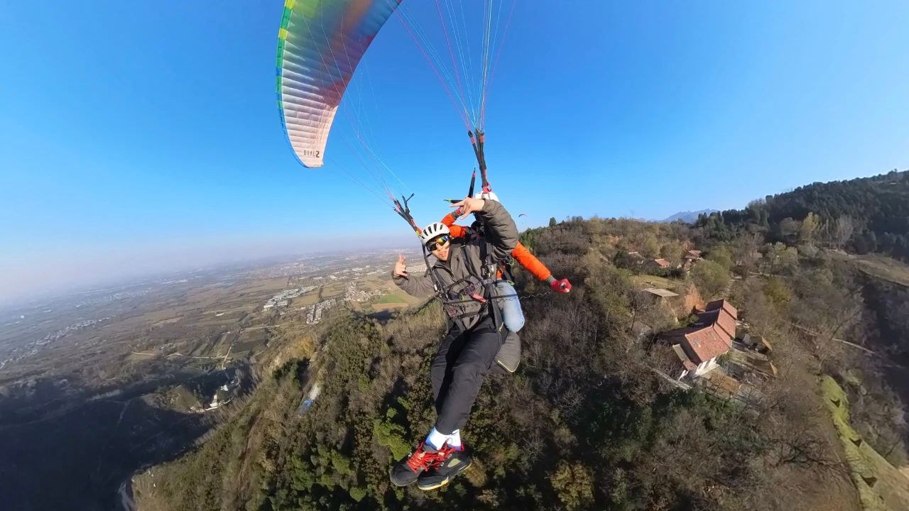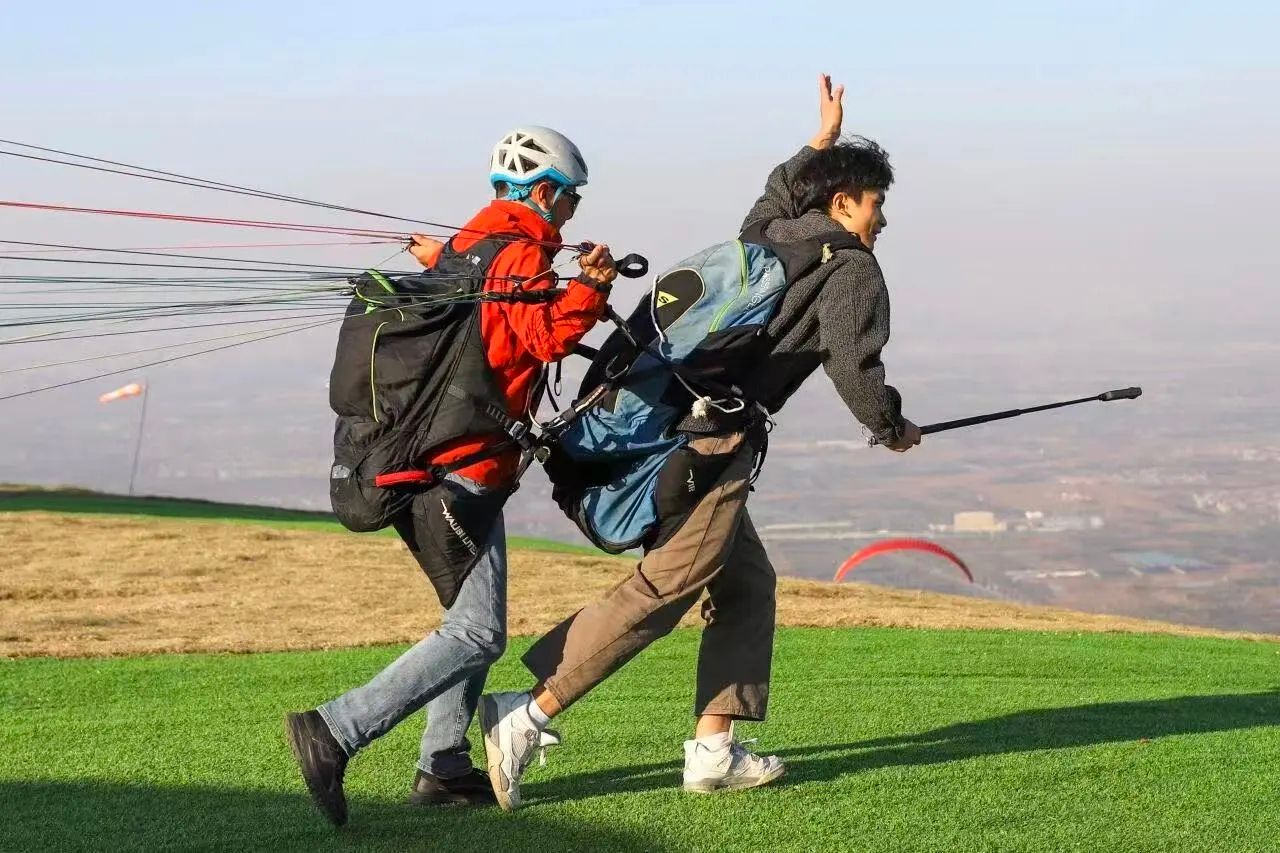 抵达滑翔伞基地后,实训实操环节有序推进。2025级学子在教练指导下,近距离观摩滑翔伞装配流程,沉浸式学习起飞助跑、空中姿态调整等实操技能,真切感受“借风而飞”的户外魅力;2023级学长率先开启实战体验,在教练陪同下完成助跑、升空、高空翱翔全流程。伞翼展开之际,身体腾空而起,地面景物渐次缩小,风声耳畔呼啸,气流托举伞翼灵活穿梭,学子高空俯瞰山河,既体验速度与自由的快感,更直观掌握气流对飞行的关键作用,实现理论知识与实地场景的深度衔接。
